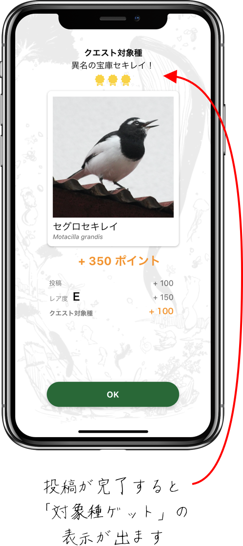 投稿完了画面で自動的にクエスト対象種として登録されます